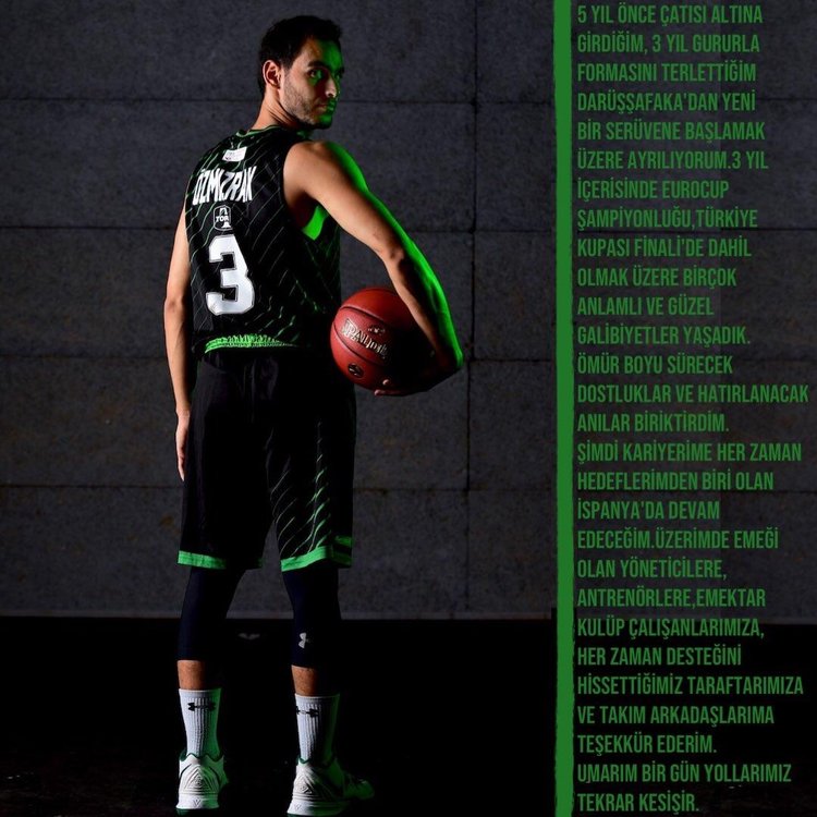"5 yıl önce çatısı altına girdiğim, 3 yıl gururla formasını terlettiğim Darüşşafaka'dan yeni bir serüvene başlamak üzere ayrılıyorum. 3 yıl içerisinde ULEB Avrupa Kupası şampiyonluğu, Türkiye Kupası finali de dahil olmak üzere birçok anlamlı ve güzel galibiyetler yaşadık. Ömür boyu sürecek dostluklar ve hatırlanacak anılar biriktirdim. Şimdi kariyerime her zaman hedeflerimden biri olan İspanya'da devam edeceğim. Üzerimde emeği olan yöneticilere, antrenörlere, emektar kulüp çalışanlarımıza, her zaman desteğini hissettiğimiz taraftarımıza ve takım arkadaşlarıma teşekkür ederim. Umarım bir gün yollarımız tekrar kesişir."