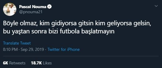 Mücadelede Beşiktaş'ın 2-0 geriye düşmesi sonrası twitter hesabından isyan eden Nouma "Böyle olmaz, kim gidiyorsa gitsin kim geliyorsa gelsin, bu yaştan sonra bizi futbola başlatmayın" mesajı paylaştı.