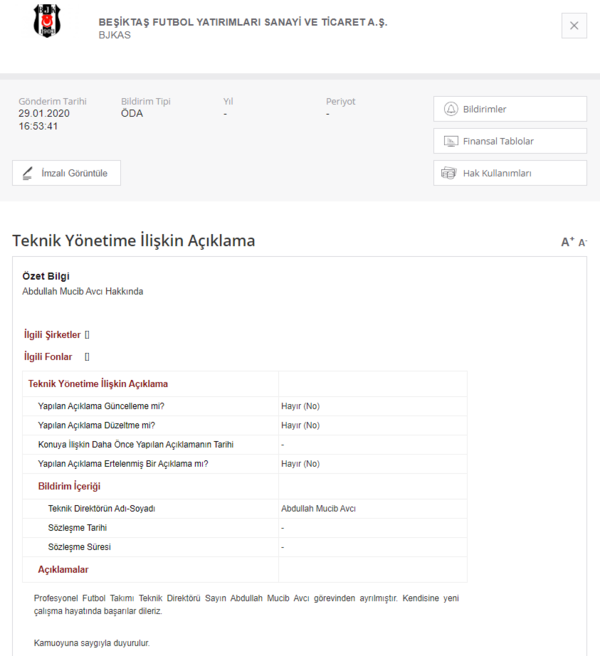 Siyah-beyazlılar bu kararı, Türkiye Futbol Federasyonu'na (TFF) resmen bildirdi. TFF'nin resmi sitesinde yer alan bilgide Abdullah Avcı'nın 29.01.2020 itibarıyla kontratının feshedildiği yer aldı.