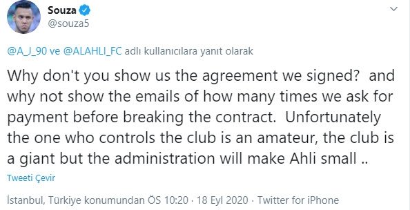 Josef de Souza ise Al Ahli'nin sosyal medya üzerinden yaptığı resmi açıklamanın altına cevap olarak, "Neden bize imzaladığımız anlaşmayı göstermiyorsunuz ve neden sözleşmeyi bozmadan önce kaç kez ödeme istediğimizin e-postalarını göstermiyorsunuz? Ne yazık ki kulübü kontrol edenler amatör. Kulüp çok büyük ama yönetim Ahli'yi küçültüyor" diye yazdı.