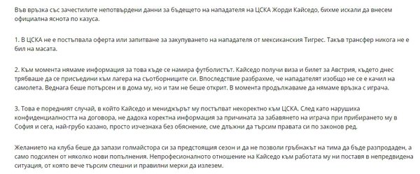 CSKA Sofya'nın resmi internet sitesinden yapılan bilgilendirmede; "Tigres'ten Caicedo için bir teklif gelmedi. Böyle bir transfer için hiçbir zaman masaya oturulmadı. Şu anda Caicedo'nun nerede olduğuna dair hiçbir bilgimiz yok. Caicedo'nun sezon başına kampına katılması gerekiyordu. Avusturya kampı için bilet almıştı ancak daha sonra uçağa binmediğini öğrendik. Kendisinden haber alamıyoruz. Evini aradık ancak ulaşamadık. Caicedo ve menajerine karşı yasal olarak haklarımızı arayacağız. Hiçbir bilgi vermeden ortadan kayboldular." ifadeleri kullanıldı.