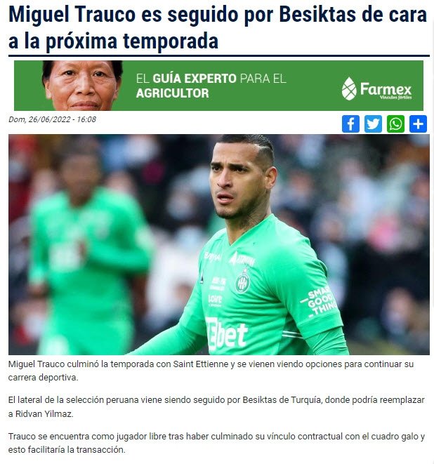 Bu doğrultuda arayışlarına devam eden Kara Kartal'dan flaş bir transfer hamlesi geldi. Peru basınından ovacion.pe adlı sitede yer alan habere göre Beşiktaş, son olarak Saint-Etienne forması giyen Miguel Trauco'yu gündemine aldı.