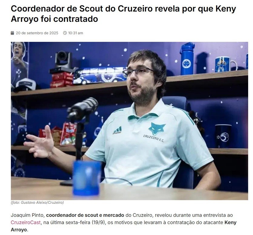 Cruzeiro'un scout ve transfer piyasası koordinatörü Joaquim Pinto, Brezilya basınına verdiği röportajda Keny Arroyo'nun transfer edilme sebeplerini açıkladı.