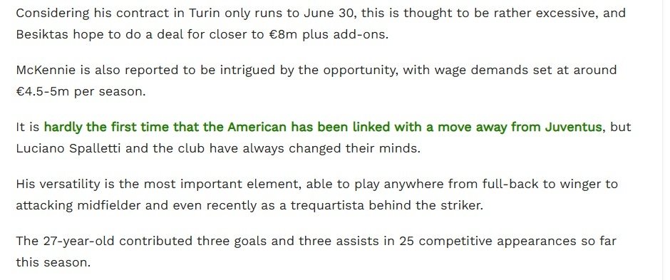 Bu sezon Juventus formasıyla 25 resmi karşılaşmaya çıkan McKennie, 3 gol ve 3 asistlik bir katkı sağladı. ABD'li oyuncunun piyasa değeri 22 milyon euro olarak gösteriliyor.