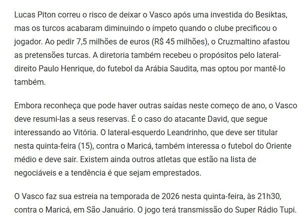 Brezilya basınında yer alan haberlere göre Vasco yönetimi, Piton için 7,5 milyon euro talep ederek Beşiktaş'ın transferdeki niyetini zayıflattı.