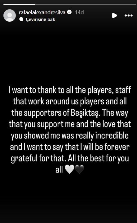 "Tüm oyunculara, bizimle çalışan personele ve Beşiktaş'ın tüm taraftarlarına teşekkür etmek istiyorum. Beni destekleme şekliniz ve bana gösterdiğiniz sevgi gerçekten inanılmazdı ve bunun için sonsuza kadar minnettar olacağımı söylemek istiyorum. Hepinize en iyisini diliyorum."