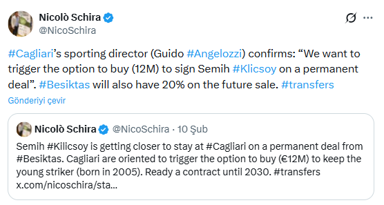 Schira, haberinde Semih Kılıçsoy'un bonservisini Beşiktaş'tan almak isteyen Cagliari'nin ödeyeceği bedelin 12 milyon euro olduğunu belirtirken ayrıca Beşiktaş'ın sonraki satıştan %20 payının olduğunu da vurguladı.