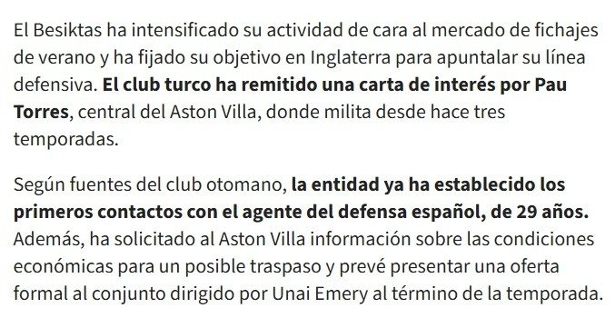 AS'ta yer alan habere göre Beşikaş, üç sezondur Aston Villa forması giyen İspanyol stoper Pau Torres için resmi ilgi mektubu gönderdi. Haberde yer alan bilgilere göre yönetim, 29 yaşındaki savunmacının menajeriyle ilk temasları da kurdu ve İngiliz ekibinden olası bir transfer için ekonomik şartlara dair bilgi talep etti.