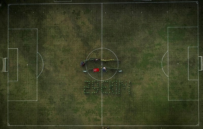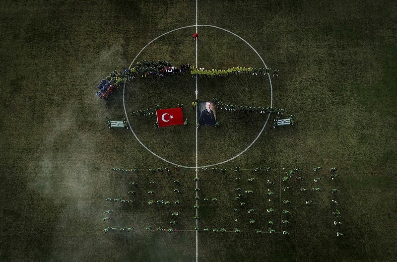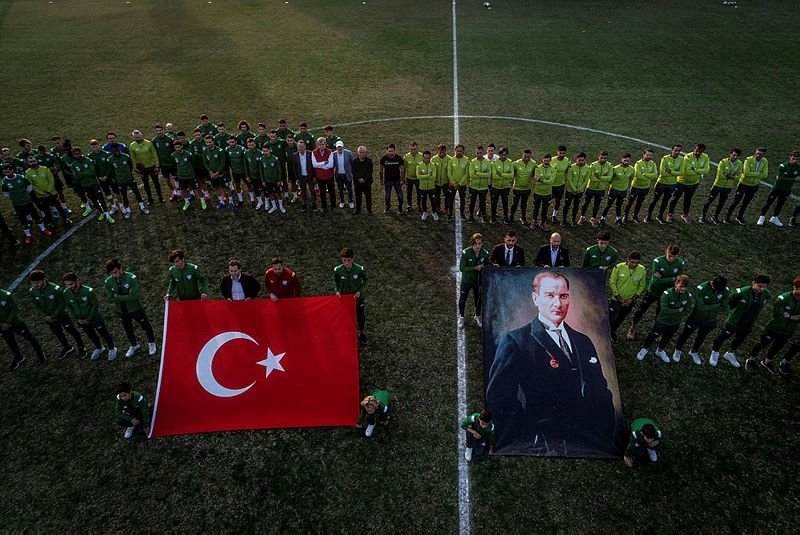 Antrenmana başlamadan önce Türk bayrağı ve Atatürk posterinin önünde toplanan yeşil-beyazlılar, "29 Ekim" koreografisini oluşturdu.