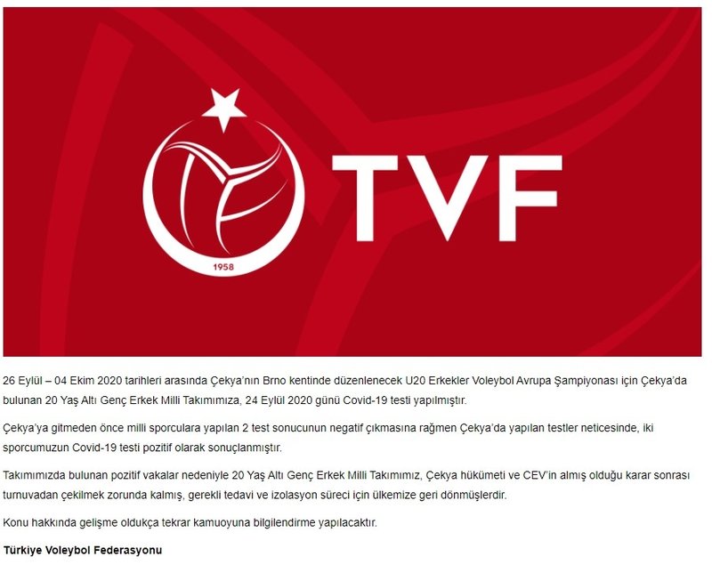 20 Yaş Altı Erkek Milli Voleybol Takımı'nın, pozitif vakalardan dolayı Çekya hükümeti ve Avrupa Voleybol Konfederasyonunun (CEV) almış olduğu karar gereği şampiyonadan çekilmek zorunda kaldığı aktarıldı.