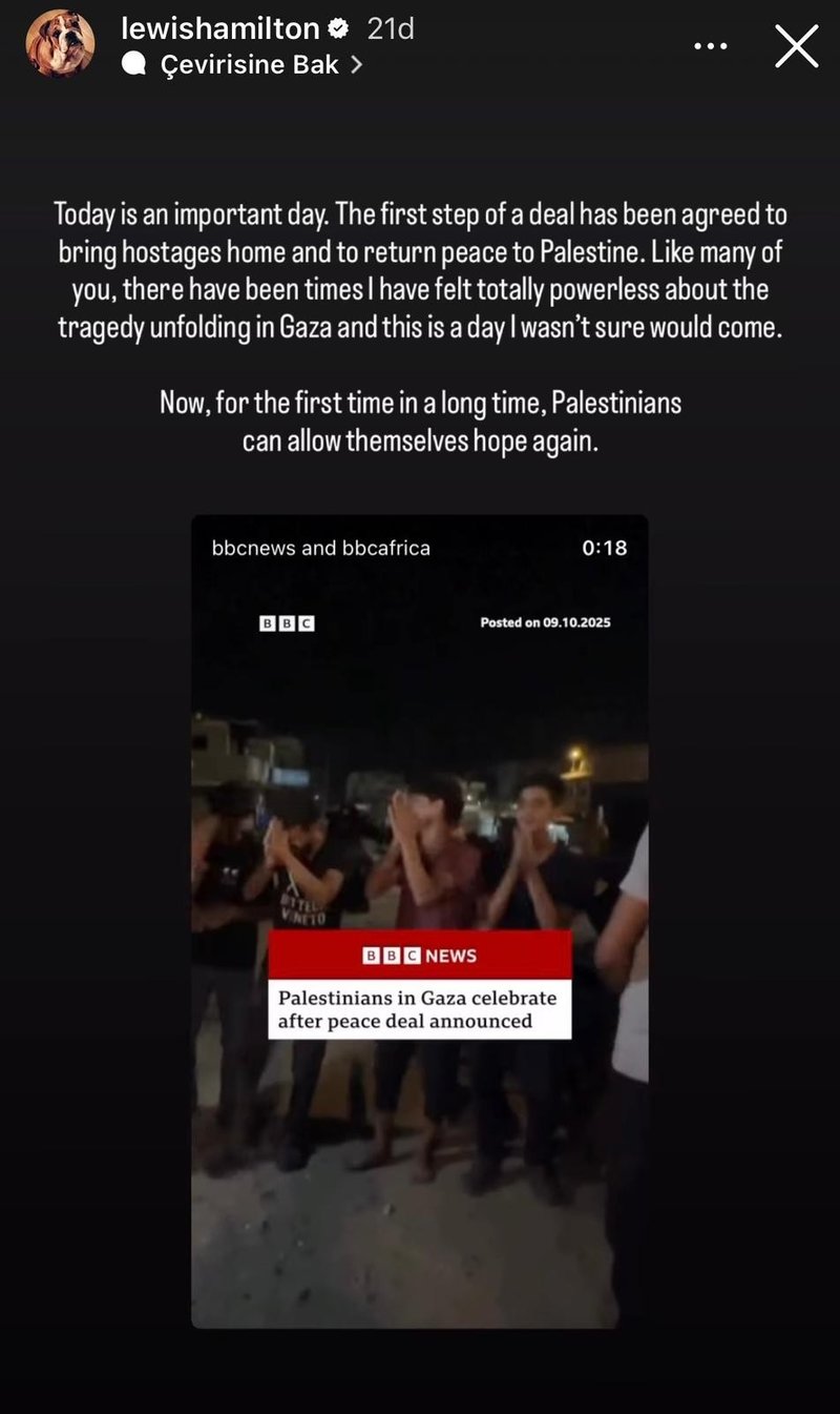 Formula 1 tarihinin gelmiş geçmiş en iyi pilotlarından kabul edilen Lewis Hamilton, Gazze'de ateşkes ilan edilmesi sonrası sosyal medya hesabından bir paylaşım yaptı.