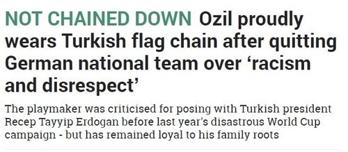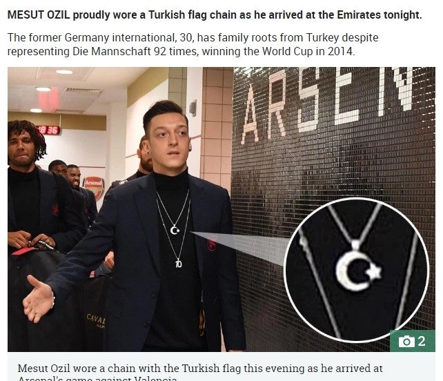 Almanların ırkçı saldırıları sonucu Almanya Milli Takımı'nı bırakan Mesut Özil, dün Arsenal'in oynadığı maç öncesi ay-yıldızlı kolye ile görüntülendi. Bu durum Alman ve İngiliz basınında geniş yer buldu.