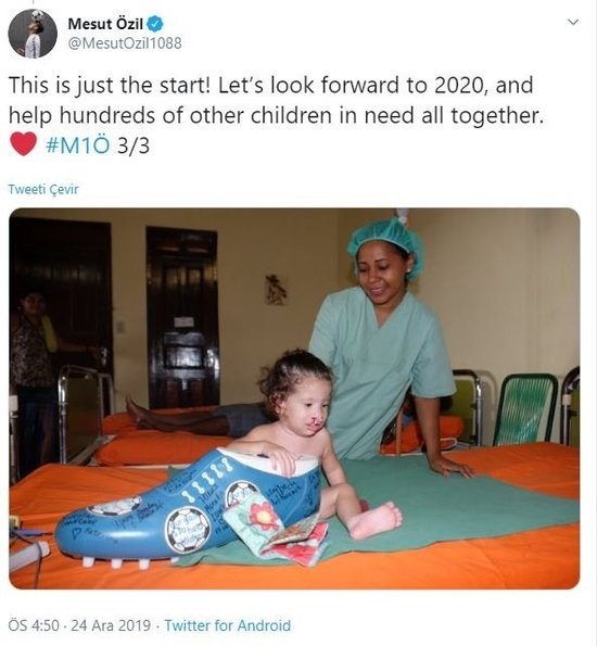 Yıldız futbolcu sosyal medya hesabından yaptığı açıklamada, "219 ameliyat yapıldı. Ancak daha fazlası da var. Eşim Amine ile hazirandaki düğünümüzden önce açıkladığımız gibi dünya üzerinde ihtiyaç sahibi bin çocuğun ameliyat masraflarını karşılayacağız. Bu kapsamda BigShoe'nun son iki senedeki inanılmaz dayanışması için çok teşekkür ederim. Düğünümüze gelip bağışta bulunanlara ve sağlık ekipleri de çok teşekkür ederim. Bu yalnızca bir başlangıç. 2020'ye doğru giderken, ihtiyacı olan çocuklara birlikte yardım edelim" ifadelerini kulllandı.