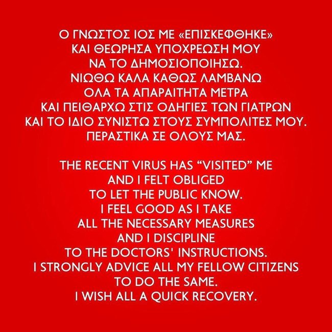"Koronavirüs beni de 'ziyaret etti' ve kendimi kamuoyunu bilgilendirmek zorunda hissettim. Kendimi iyi hissediyorum çünkü tüm gerekli önlemleri aldım ve doktorların tavsiyelerine uyuyorum. Tüm dostlarıma ve vatandaşlarıma aynısını tavsiye ediyorum."