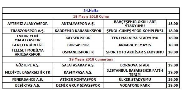 Türkiye Futbol Federasyonu, Şampiyonluğu ve ilk dördün sıralamasını etkileyecek Spor Toto Süper Lig'in 34. haftanın maç programını açıkladı. Fenerbahçe, Galatasaray, Medipol Başakşehir ve Beşiktaş maçlarını 19 Mayıs Cumartesi günü saat 19:00'da oynayacak.