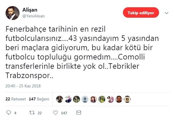 Sosyal medya hesabından Sportif Direktör Comolli'yi eleştiren Alişan, "Fenerbahçe tarihinin en rezil futbolcularısınız... 43 yasındayım, 5 yaşından beri maçlara gidiyorum, bu kadar kötü bir futbolcu topluluğu görmedim... Comolli, transferlerinle birlikte yok ol... Tebrikler Trabzonspor..." sözleriyle tepkisini dile getirdi.