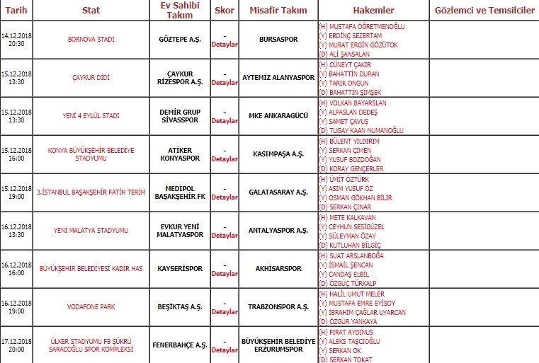 Spor Toto Süper Lig'de 16. hafta karşılaşmaları 14, 15, 16 ve 17 Aralık tarihlerinde, Spor Toto 1. Lig'de 16. hafta karşılaşmaları 14, 15 ve 16 Aralık tarihlerinde, TFF 2. Lig'de 17. hafta karşılaşmaları 15 ve 16 Aralık tarihlerinde, TFF 3. Lig'de 17. hafta karşılaşmaları 15 ve 16 Aralık tarihlerinde oynanacak.