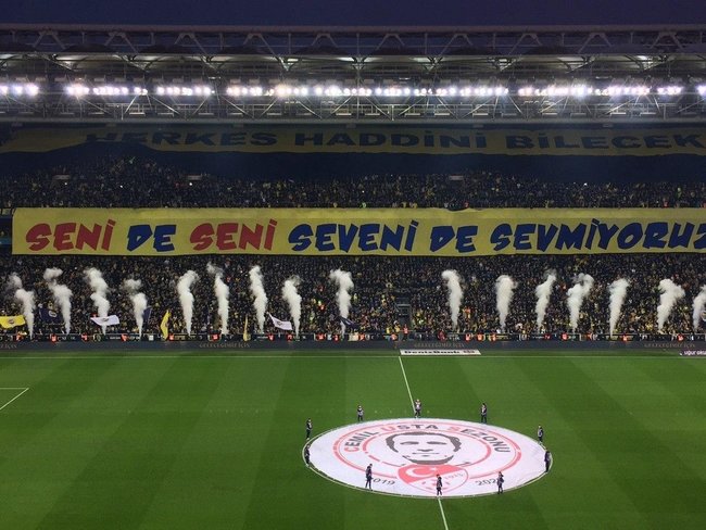 Sarı - lacivertli taraftarlar, öte yandan iki büyük pankart açtı. Pankartlarda, "Herkes haddini bilecek" ve "Seni de seni seveni de sevmiyoruz" yazıları yer aldı.