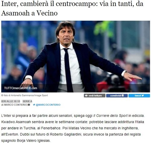 Öte yandan ayrılacak isimlerin Asamoah ile sınırlı kalmayacağı, Premier Lig ekibi Everton'un istediği Matias Vecino'nun da ayrılışına izin verileceği yazıldı. Son olarak, Borja Valero ile Roberto Gagliardini'nin de takım içerisindeki geleceğinin sarsıntıda olduğu duyuruldu.