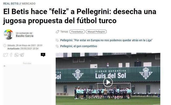 Haberin detaylarında, Manuel Pellegrini'nin Fenerbahçeli yetkililere teşekkür ettiği ve bu teklifi reddettiği kaydedildi. Pellegrini'nin, İspanya'da mutlu olduğu ve Real Betis'ten ayrılmak istemediği yazıldı.