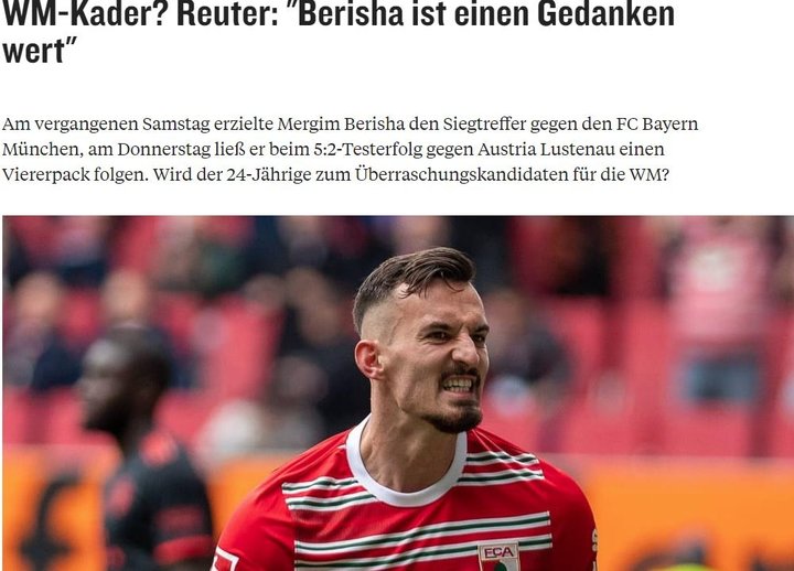 Genç forvet, Alman ekibinin Austria Lustenau'yu 5-2 mağlup ettiği hazırlık maçında ise adeta şov yaptı ve 90 dakikayı 4 golle tamamladı. Berisha'nın bu performansı sonrası Ausburg'un sportif direktörü Stefan Reuter, Kicker'a açıklamalarda bulundu. Reuter, "Almanya'nın Dünya Kupası kadrosunda bir sürpriz olursa forvetimiz Mergim Berisha değerlendirilebilir." ifadelerini kullandı.