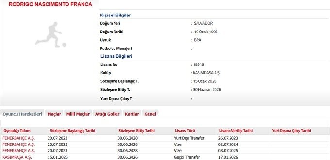 Fenerbahçe, savunma oyuncularından Rodrigo Becao'nun sezon sonuna kadar Kasımpaşa'ya kiralandığını Türkiye Futbol Federasyonu'na bildirdi.
