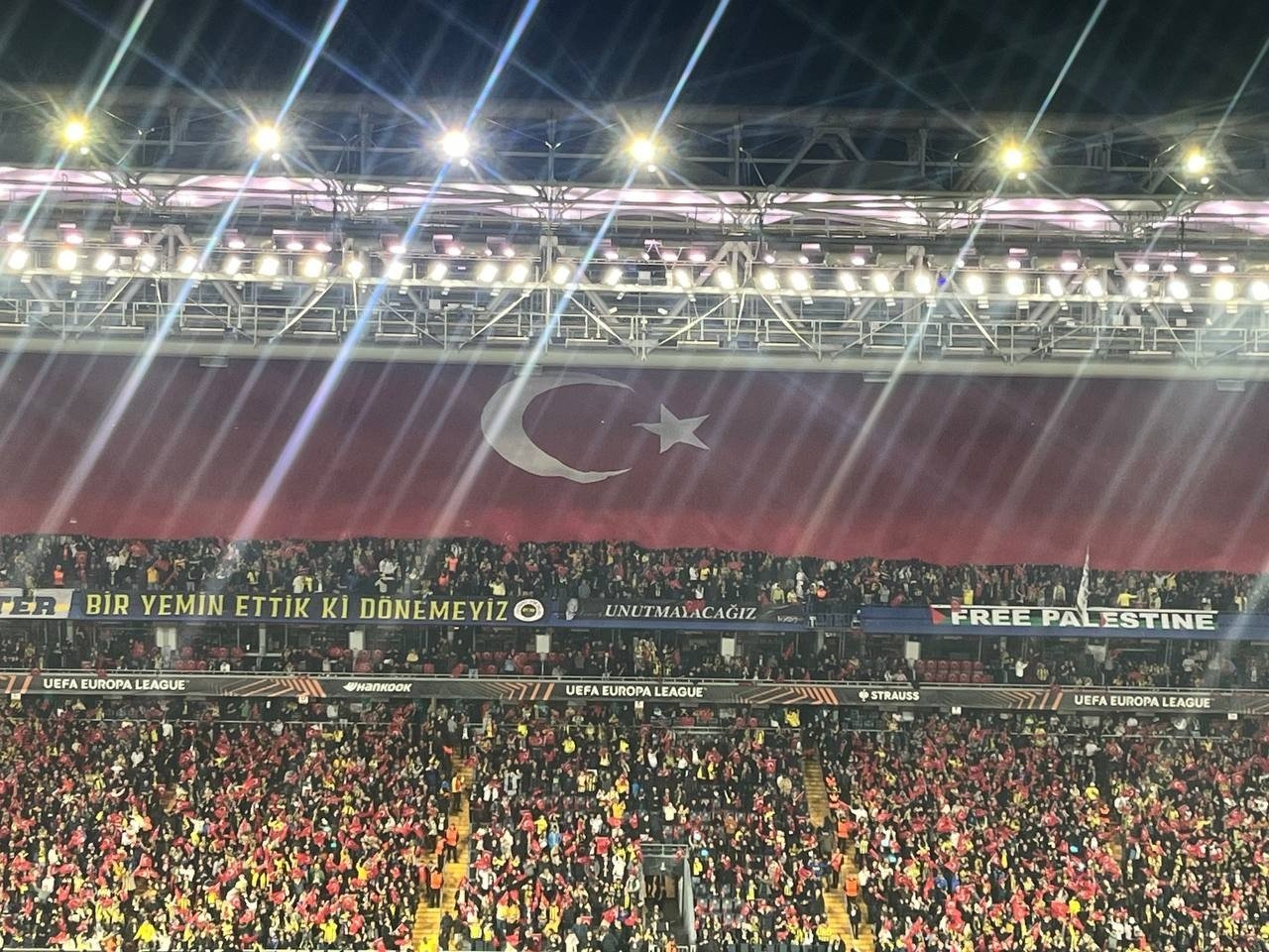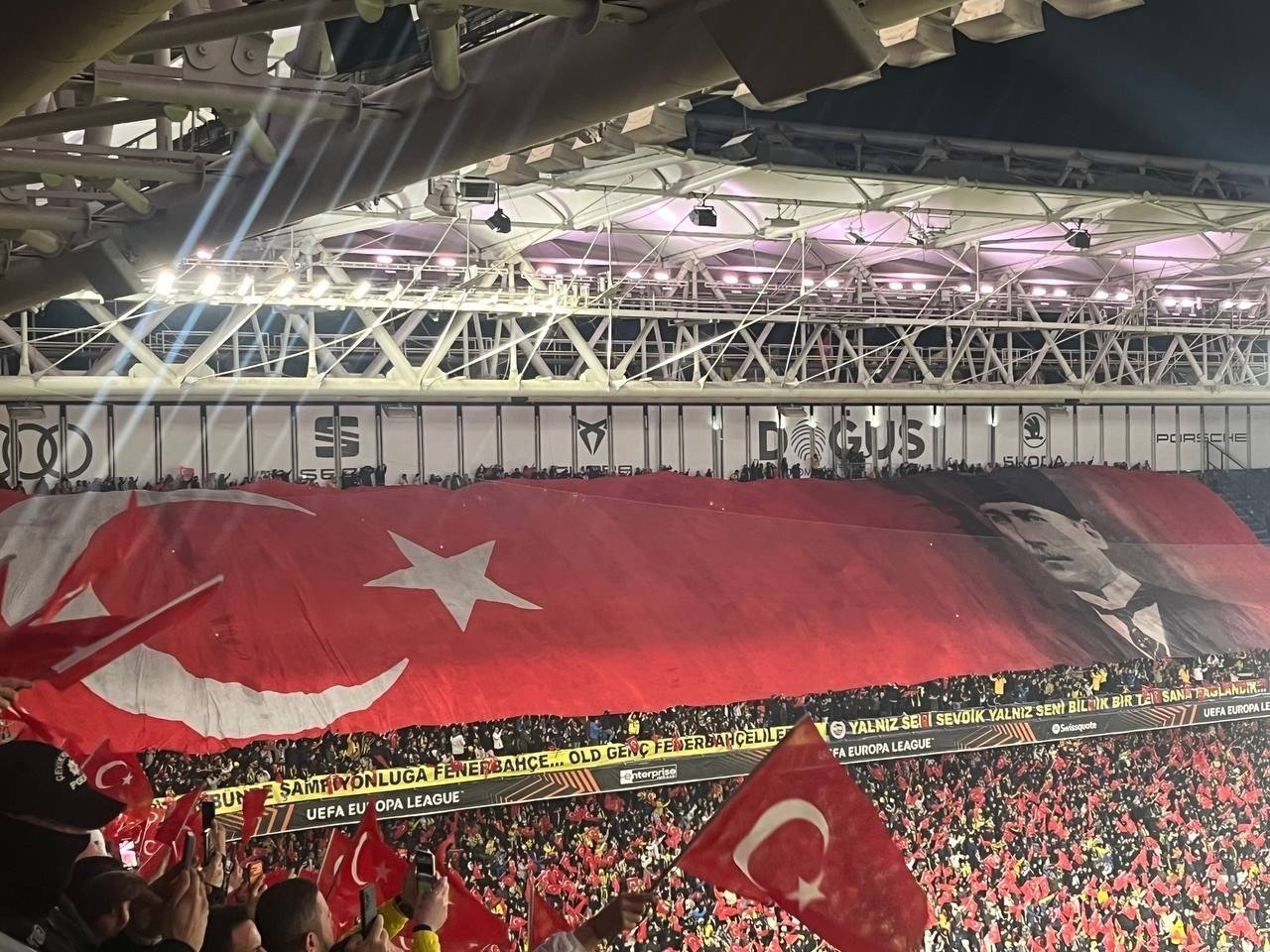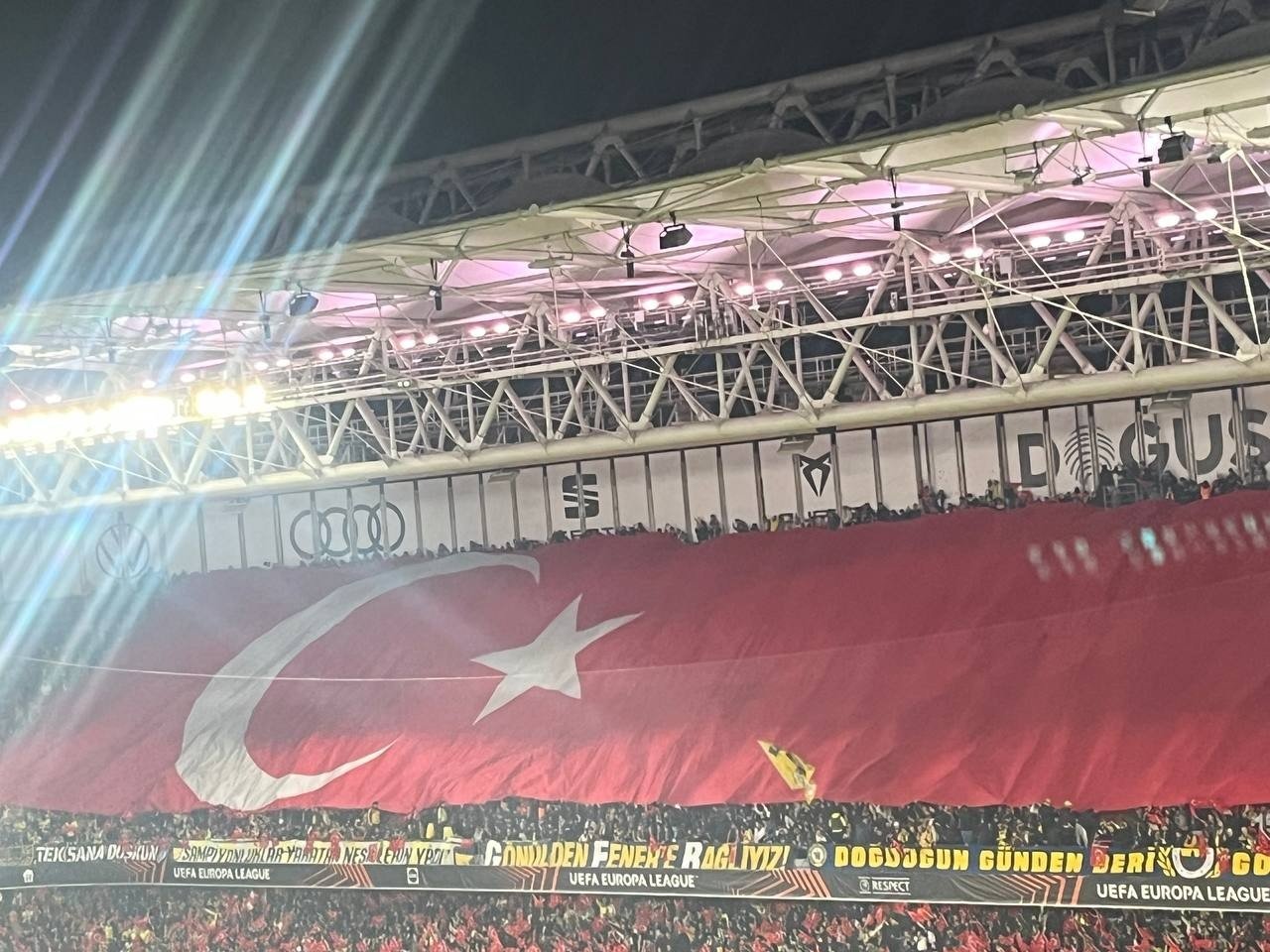 UEFA Avrupa Ligi'ndeki temsilcimiz Fenerbahçe, 7. hafta maçında Aston Villa'yı konuk etti. Sarı-lacivertliler, Chobani Stadyumu'nu Türk bayraklarıyla donattı. Mücadele öncesi stadyumda yer alan koltuklara 50 binden fazla Türk bayrağı yerleştirildi.