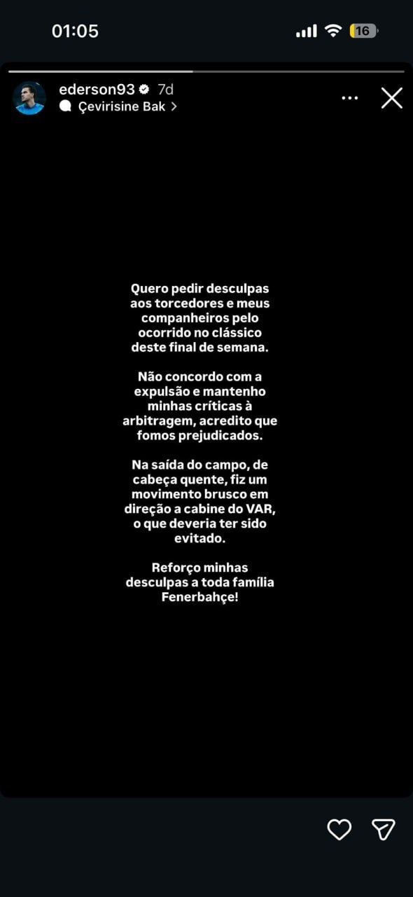 Ederson yapmış olduğu paylaşımda, "Derbide yaşananlar nedeniyle taraftarlardan ve takım arkadaşlarımdan özür dilerim. Kırmızı kart kararına katılmıyorum ve hakem yönetimine yönelik eleştirilerimi sürdürüyorum; haksızlığa uğradığımızı düşünüyorum. Sahadan çıkarken, sinirlerim gerginken VAR kabinine doğru ani bir hareket yaptım; bu yapılmaması gereken bir şeydi. Tüm Fenerbahçe ailesinden tekrar özür diliyorum." ifadelerini kullandı.