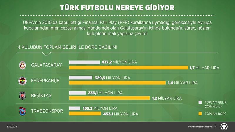 Galatasaray, Fenerbahçe, Beşiktaş ve Trabzonspor, geçtiğimiz ocak ayında, 30 Kasım 2015 itibarıyla olan şirket borçlarını KAP'a bildirdi.