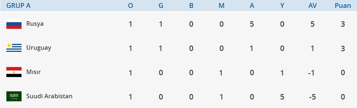 A Grubu'nda ilk maçların ardından 3 puanlı takımlardan Rusya liderliğini sürdürürken, Uruguay ise ikinci sırada yer aldı. Puansız takımlardan Mısır üçüncü, Suudi Arabistan ise son sırada bulunuyor.