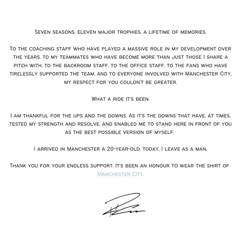 Sosyal paylaşım sitesi Twitter hesabından duygusal bir veda mesajı paylaşan 27 yaşındaki oyuncu, "Yedi sezon. On bir kupa... Hayat boyu unutulmayacak anılar. Teknik ekip, yıllar içindeki gelişimimde önemli rol üstlendi. Takım arkadaşlarım, stadı paylaştığım kişilerin çok ötesine geçti. Kulübün diğer çalışanları, yönetim ve taraftarlar beni yorulmadan destekledi. Manchester City ile ilişkisi olan herkes; size duyduğum saygı daha fazla olamazdı. Ne yolculuk oldu ama... Manchester'a geldiğimde 20 yaşında bir çocuktum ama bugün bir erkek olarak buradan ayrılıyorum." ifadelerini kullandı.