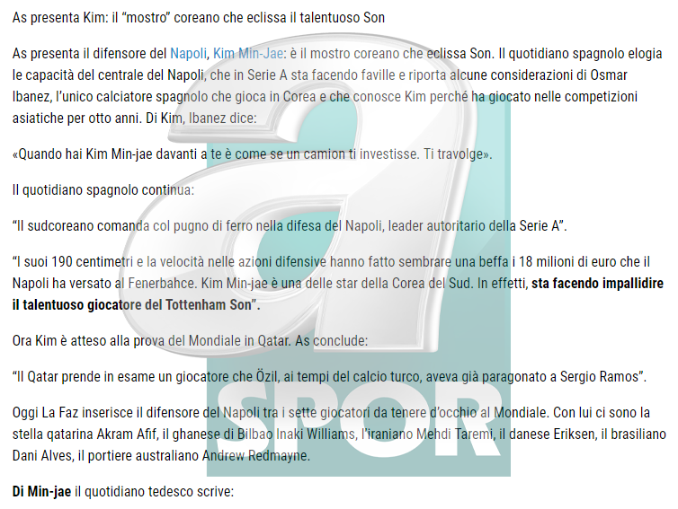 İspanyol basını ise Min-Jae için, "Güney Kore, Serie A'nın otoriter lideri Napoli'nin savunmasında demir yumrukla komuta ediyor. 1.90'lık boyu ve savunmadaki hızıyla kendisi için ödenen bonservis bedelini şaka gibi gösterdi. Kim Min-Jae Güney Kore'nin yıldızlarından biri ve Tottenham'da Heung-Min Son'u solgunlaştırıyor." ifadelerini kullandı.