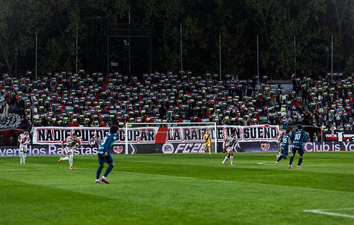 Ev sahibi takımın taraftarları Filistin'e destek için tribünlerde bayrak açtı.