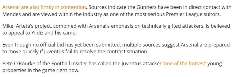 Milli futbolcu ile ilgilenen bir başka takım Arsenal, transfer yarışının en güçlü adaylarından biri olarak gösteriliyor. Habere göre, Mikel Arteta'nın projesi ve Arsenal'ın teknik kapasitesi yüksek hücumculara verdiği önem, Kenan Yıldız ve ekibi için cazip unsurlar olarak değerlendiriliyor.