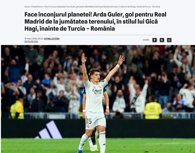 Rumen basınından Prosport; Arda Güler'in Elche'ye attığı golü, Gheorghe Hagi'nin Real Madrid forması giyerken Osasuna'ya attığı gole benzeterek, "Dünyayı ayağa kaldırdı! Arda Güler, Türkiye–Romanya maçı öncesinde Real Madrid formasıyla orta sahadan, adeta Gică Hagi tarzı bir gole imza attı" ifadeleriyle manşete taşıdı.