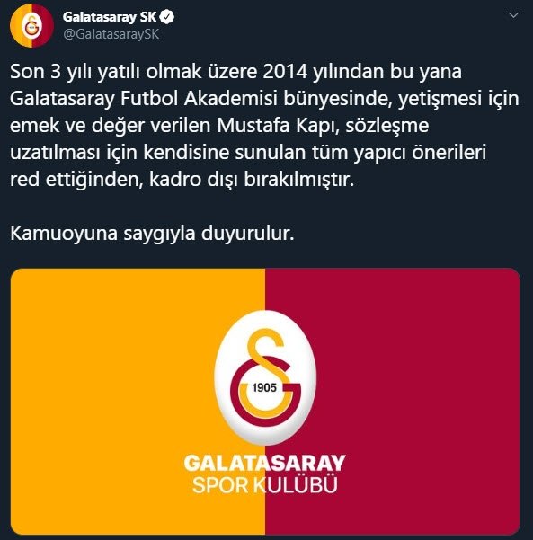 Sarı-kırmızılı kulüpten yapılan açıklamada, "Son 3 yılı yatılı olmak üzere 2014 yılından bu yana Galatasaray Futbol Akademisi bünyesinde, yetişmesi için emek ve değer verilen Mustafa Kapı, sözleşme uzatılması için kendisine sunulan tüm yapıcı önerileri red ettiğinden, kadro dışı bırakılmıştır. Kamuoyuna saygıyla duyurulur." ifadelerine yer verildi.
