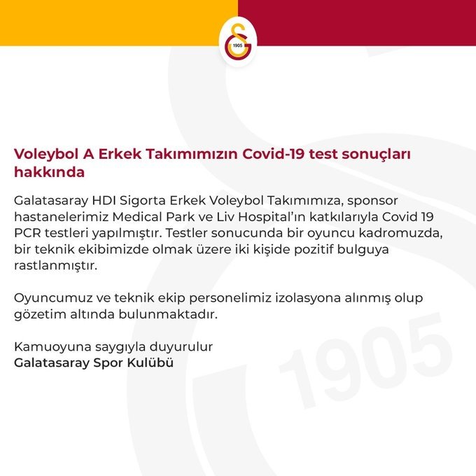 "Galatasaray HDI Sigorta Erkek Voleybol Takımımıza, sponsor hastanelerimiz Medical Park ve Liv Hospital'ın katkılarıyla Covid 19 PCR testleri yapılmıştır. Testler sonucunda bir oyuncu kadromuzda, bir teknik ekibimizde olmak üzere iki kişide pozitif bulguya rastlanmıştır.