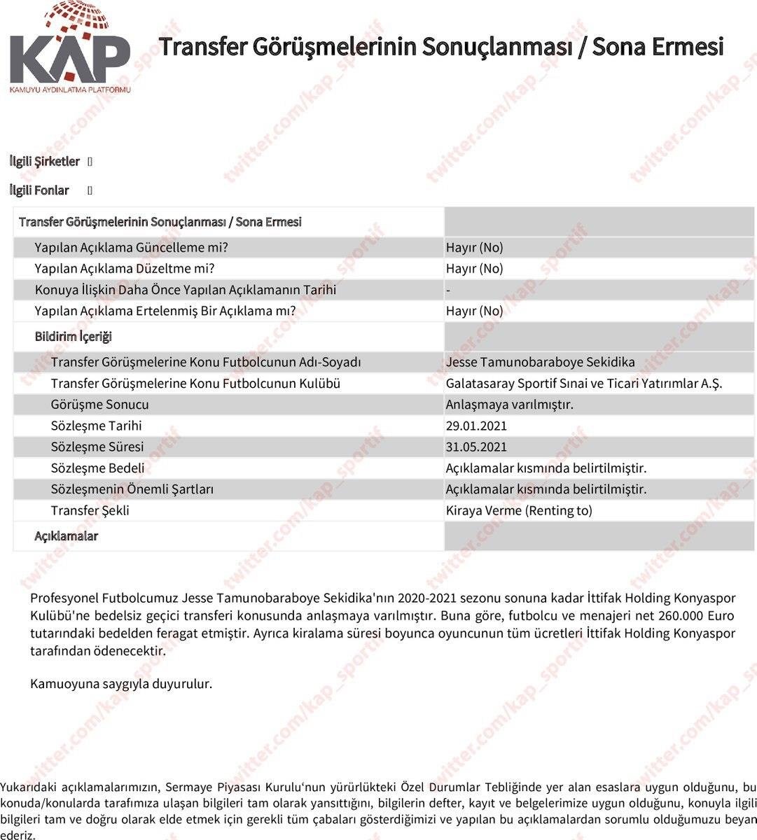 Sarı-kırmızılı kulüpten KAP'a yapılan açıklamada "Profesyonel Futbolcumuz Jesse Tamunobaraboye Sekidika'nın 2020-2021 sezonu sonuna kadar İttifak Holding Konyaspor Kulübü'ne bedelsiz geçici transferi konusunda anlaşmaya varılmıştır. Buna göre, futbolcu ve menajeri net 260.000 Euro tutarındaki bedelden feragat etmiştir. Ayrıca kiralama süresi boyunca oyuncunun tüm ücretleri İttifak Holding Konyaspor tarafından ödenecektir. Kamuoyuna saygıyla duyurulur." ifadelerine yer verildi.