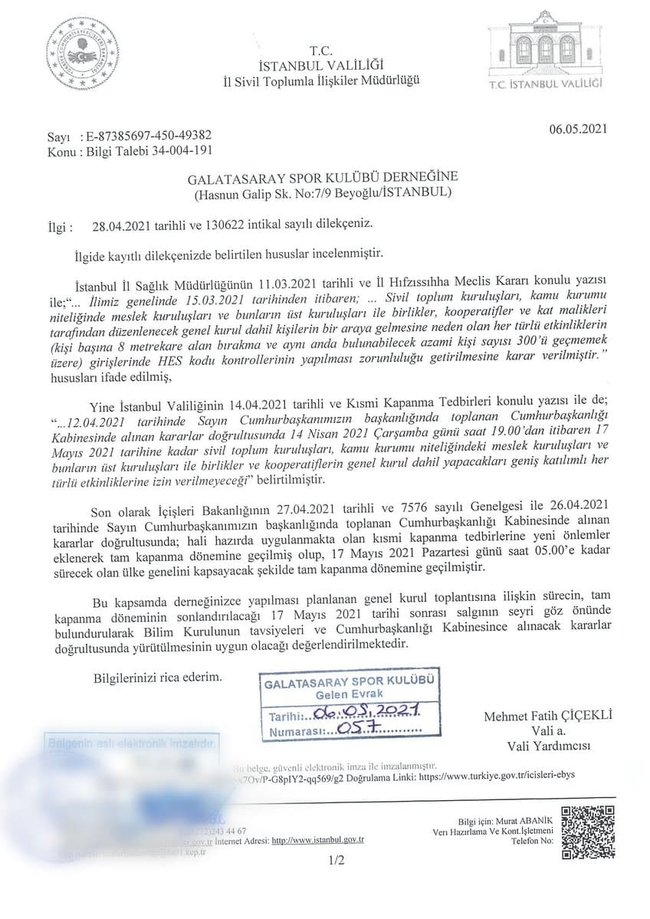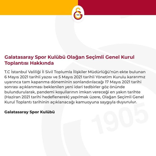 Kulüpten konuyla ilgili yapılan açıklamada şu ifadeler yer aldı: "T.C İstanbul Valiliği İl Sivil Toplumla İlişkiler Müdürlüğü'nün ekte bulunan 6 Mayıs 2021 tarihli yazısı ve 5 Mayıs 2021 tarihli Yönetim Kurulu kararımız uyarınca tam kapanma döneminin sonlandırılacağı 17 Mayıs 2021 tarihi sonrası açıklanması beklenilen yeni idari tedbirler göz önünde bulundurularak, pandemi koşullarının imkan vereceği en yakın tarihte (Haziran 2021 tarihi hedeflenerek) yapılmak üzere, Olağan Seçimli Genel Kurul Toplantı tarihinin açıklanacağı kamuoyuna saygıyla duyurulur."