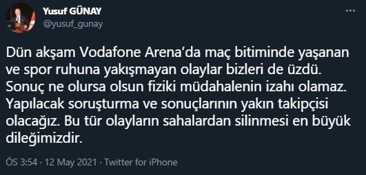 Sarı-kırmızılı kulübün başkan yardımcısı Yusuf Günay, sosyal medya hesabından yaptığı açıklamada "Dün akşam Vodafone Arena'da maç bitiminde yaşanan ve spor ruhuna yakışmayan olaylar bizleri de üzdü. Sonuç ne olursa olsun fiziki müdahalenin izahı olamaz. Yapılacak soruşturma ve sonuçlarının yakın takipçisi olacağız. Bu tür olayların sahalardan silinmesi en büyük dileğimizdir." ifadelerini kullandı.