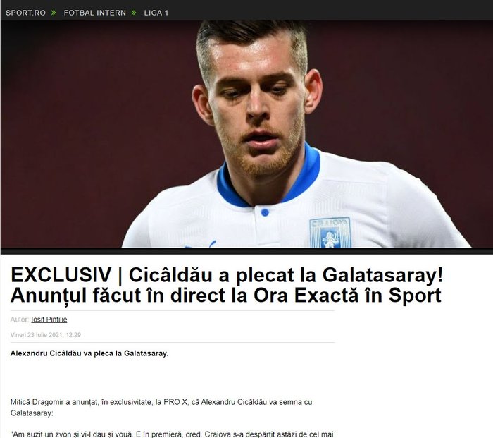 Romanya Futbol Ligi'nin eski başkanı Mitica Dragomir, bir televizyon programında yaptığı açıklamada Galatasaray'ın 24 yaşındaki Alexandru Cicaldau için kulübü Universitatea Craiova ile 6 milyon Euro ve sonraki satıştan %20 pay karşılığı anlaşmaya vardığını söyledi.