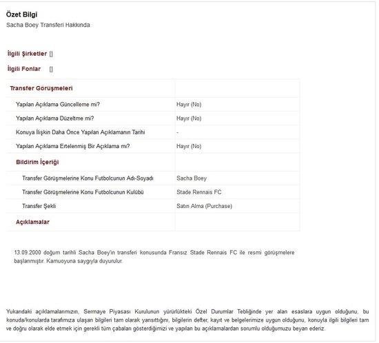 Galatasaray SK: "13.09.2000 doğum tarihli Sacha Boey'in transferi konusunda Fransız Stade Rennais FC ile resmi görüşmelere başlanmıştır. Kamuoyuna saygıyla duyurulur."