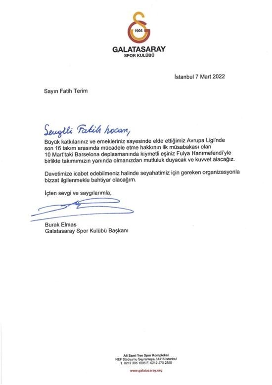 Galatasaray Başkanı Burak Elmas, Fatih Terim ve eşi Fulya Terim'i 10 Mart'ta Barcelona ile Nou Camp'ta oynanacak maça davet etti.