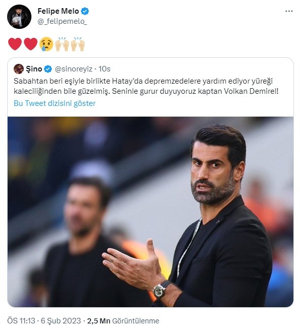 Sarı-kırmızılı bir taraftar, "Sabahtan beri eşiyle birlikte Hatay'da depremzedelere yardım ediyor yüreği kaleciliğinden bile güzelmiş. Seninle gurur duyuyoruz kaptan Volkan Demirel!" tweet'i atarken, Melo bu tweet'i alıntıladı.