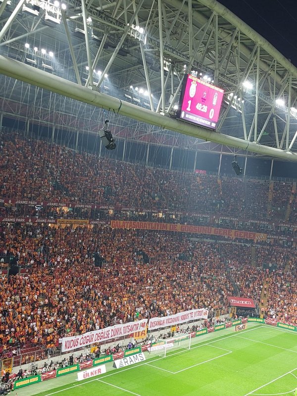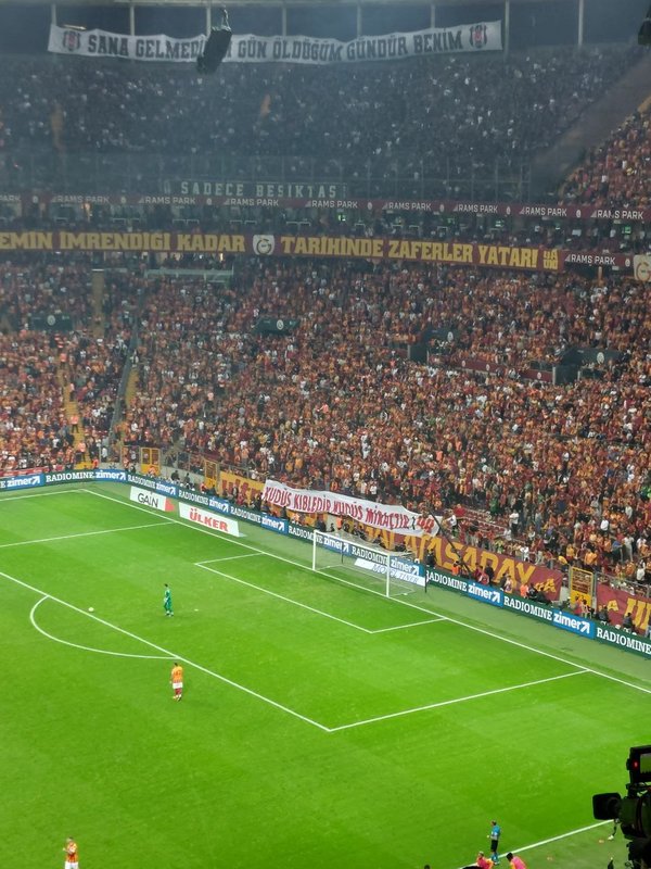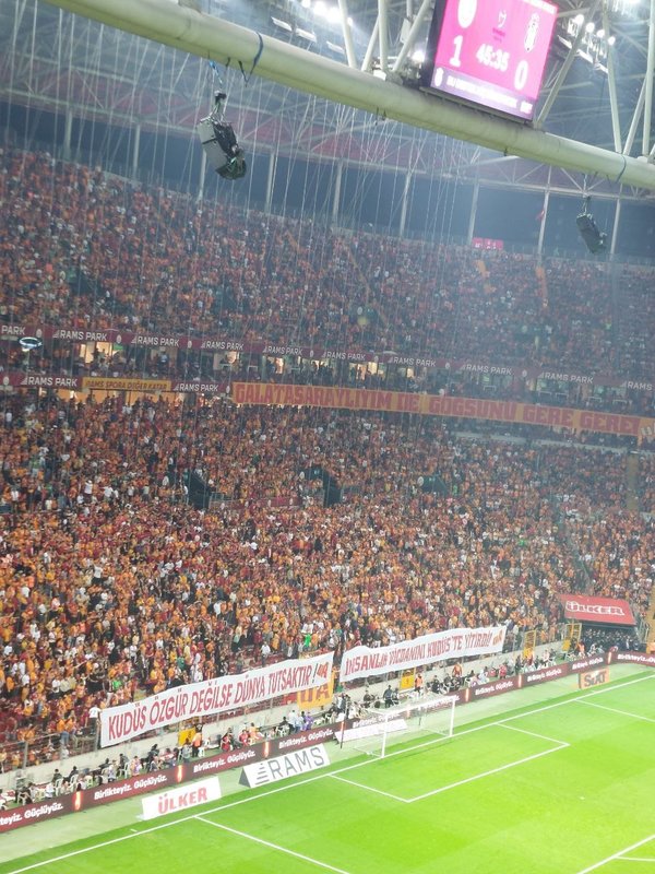 Dev maç öncesi sarı-kırmızılı taraftarlar, Filistin'e destek pankartı açtı. Pankartta, "Kudüs özgür değilse dünya tutsaktır", "İnsanlık vicdanını Kudüs'te yitirdi" ifadeleri yer aldı.