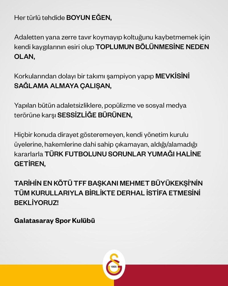 Galatasaray, yaptığı "Mehmet Büyükekşi'nin tüm kurullarıyla birlikte derhal istifa etmesini bekliyoruz" şeklindeki açıklamasıyla Türkiye Futbol Federasyonu Başkanı'nı istifaya davet etti.