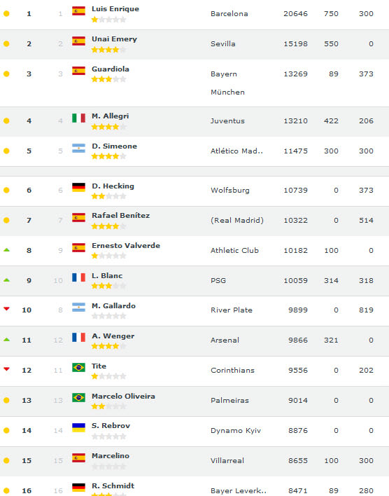 1 - Luis Enrique Barcelona 20.646 puan 2 - Unai Emery Sevilla 15.198 puan 3 - Pep Guardiola Bayern Münih 13.269 puan 4 - Massimiliano Allegri Juventus 13.210 puan 5 - Diego Simeone Atletico Madrid 11.475 puan 6 - Dieter Hecking Wolfsburg 10.739 puan 7 - Rafael Benitez Boşta (En son Napoli) 10.322 puan 8 - Ernesto Valverde Atletic Bilbao 10.182 puan 9 - Laurent Blanc Paris Saint-Germain 10.059 puan 10 - Marcelo Gallardo River Plate 9899 puan 11 - Arsene Wenger Arsenal 9866 puan 12 - Tite Corinthians 9556 puan 13 - Marcelo Oliviera Palmeiras 9014 puan 14 - Sergiy Rebrov Dinamo Kiev 8876 puan 15 - Marcelino Villarreal 8655 puan 16 - Roger Schmidt Bayer Leverkusen 8471 puan 17 - Lopetegui Boşta (En son Porto) 8422 18 - Kang-Hee Choi Jenobuk Motors 8405 puan 19 - Manuel Pellegrini Manchester City 8379 puan 20 - Andre Villas-Boas Zenit St. Petersburg 8329 puan 89 - Vitor Pereira Fenerbahçe 4639 puan 151 - Şenol Güneş Beşiktaş 3373 puan 828 - Mustafa Denizli Galatasaray 520 puan 1377 - Hami Mandıralı Trabzonspor 282 puan