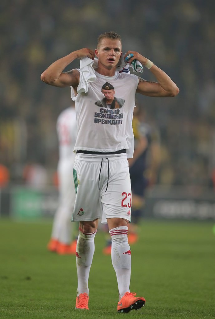 90 dakika bitince formasını çıkaran Tarasov'un Rusya Devlet Başkanı Vladimir Putin'in tişörtünü içine giydiği görüldü. Putin fotoğrafının altında Rusça, "En kibar Devlet Başkanı" yazısı yer alıyor.