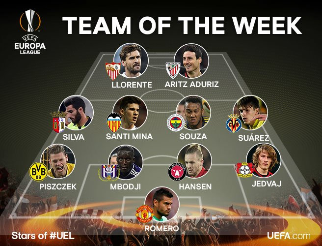 UEFA Avrupa Ligi'nde haftanın 11'i açıklandı. Fenerbahçe'den de bir oyuncu ilk 11'de yer aldı. Sergio Romero - Manchester United Lukasz Piszczek - Borusssia Dortmund Kara Mbodji - Anderlecht Kian Hansen - Midtjylland Tin Jedvaj - Bayer Leverkusen Rafa Silva - Braga Santi Mina - Valencia Josef de Souza - Fenerbahçe Denis Suarez - Villareal Fernando Llorente - Sevilla Aritz Aduriz - Atletico Bilbao