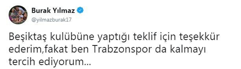 Geçmişte Beşiktaşlı olduğunu her fırsatta dile getiren Burak Yılmaz, dün tamamlanmayan transfer görüşmelerinin ardından sosyal medya hesabından bir açıklama yaptı. Golcü oyuncu, "Beşiktaş kulübüne yaptığı teklif için teşekkür ederim; fakat ben Trabzonspor'da kalmayı tercih ediyorum..." diye konuştu.